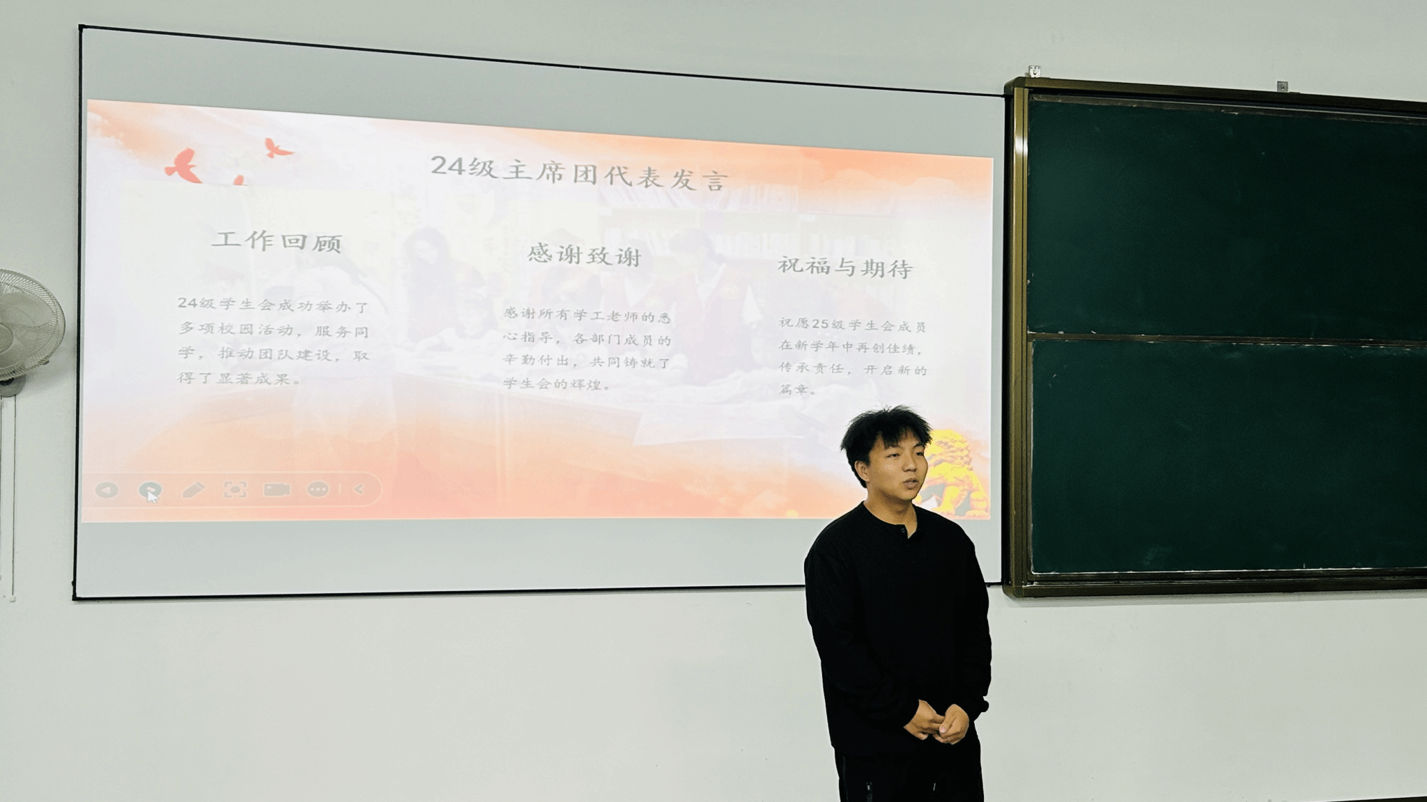 会议伊始,上届学生会主席胡文棵上台分享工作心得。他结合自身任职经历,从活动策划、团队管理、服务同学等多个维度展开交流,细致梳理了过往工作中的经验与感悟,并对学生会给予的成长平台表达了诚挚谢意。同时,他寄语新任部长们要勇于担当责任,积极创新工作方法,在传承优良传统的基础上再创佳绩,展现学生会的青春风采。