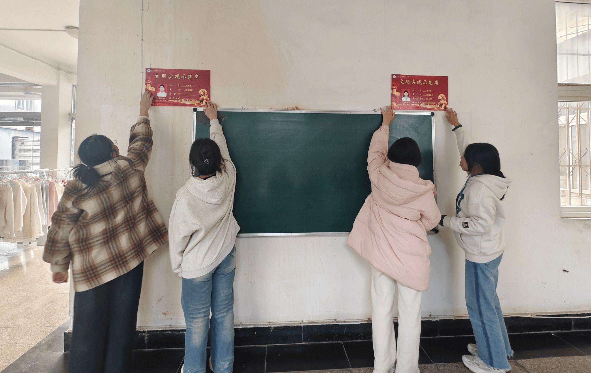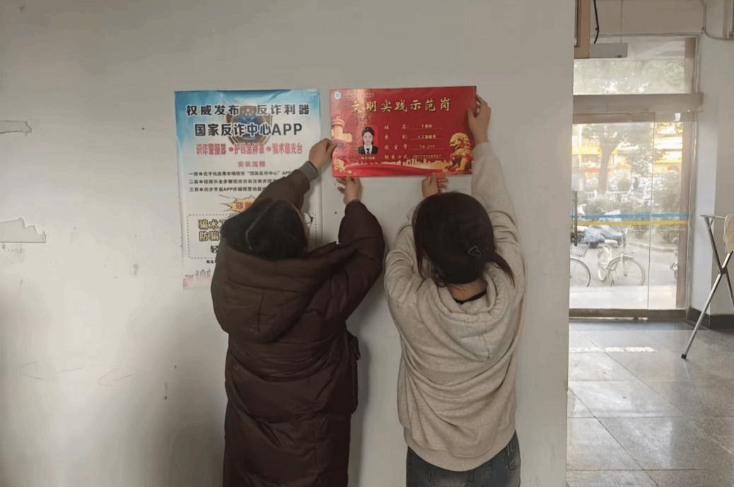 随后,刘一老师、胡章丽老师与学生干部代表一同前往指定楼栋,亲手为文明实践示范岗挂牌。挂牌过程中,两位老师与学生干部亲切交流,详细询问示范岗职责分工、日常工作规划等情况,叮嘱大家要以身作则,从细节入手,用实际行动带动楼栋同学共同参与文明创建,让 “说文明话、行文明事、做文明人” 的理念深入人心。学生干部代表表示,将牢记老师嘱托,不负荣誉使命,主动担当文明实践的践行者、传播者,让示范岗真正成为楼栋文明建设的 “坚强堡垒”。