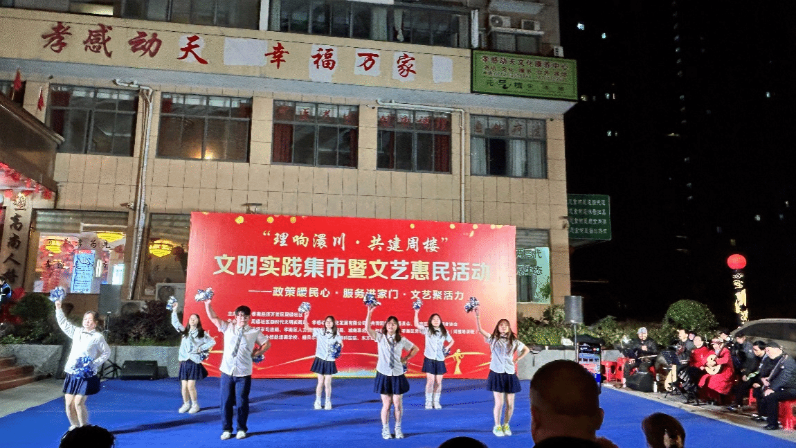 活动现场,志愿者们分工协作、活力满满。舞台之上,他们带来的啦啦操表演节奏明快、动作整齐,饱满的精神状态、昂扬的青春风貌感染了在场每一位居民,欢快的旋律与热烈的掌声交织,让社区广场充满欢声笑语明,也彰显了青年学子扎根基层、服务群众的责任与担当。辅导员张文娇老师说到:“看到同学们在舞台上活力四射的表现,在现场忙前忙后的身影,我由衷地为大家感到骄傲!‘理响澴川・共建周楼’不是一次简单的文艺惠民,更是青年学子扎根基层、践行初心的生动实践,你们带着知识走进社区,带着真诚贴近居民,就是要让‘奉献、友爱、互助、进步’的志愿精神在基层落地生根。!