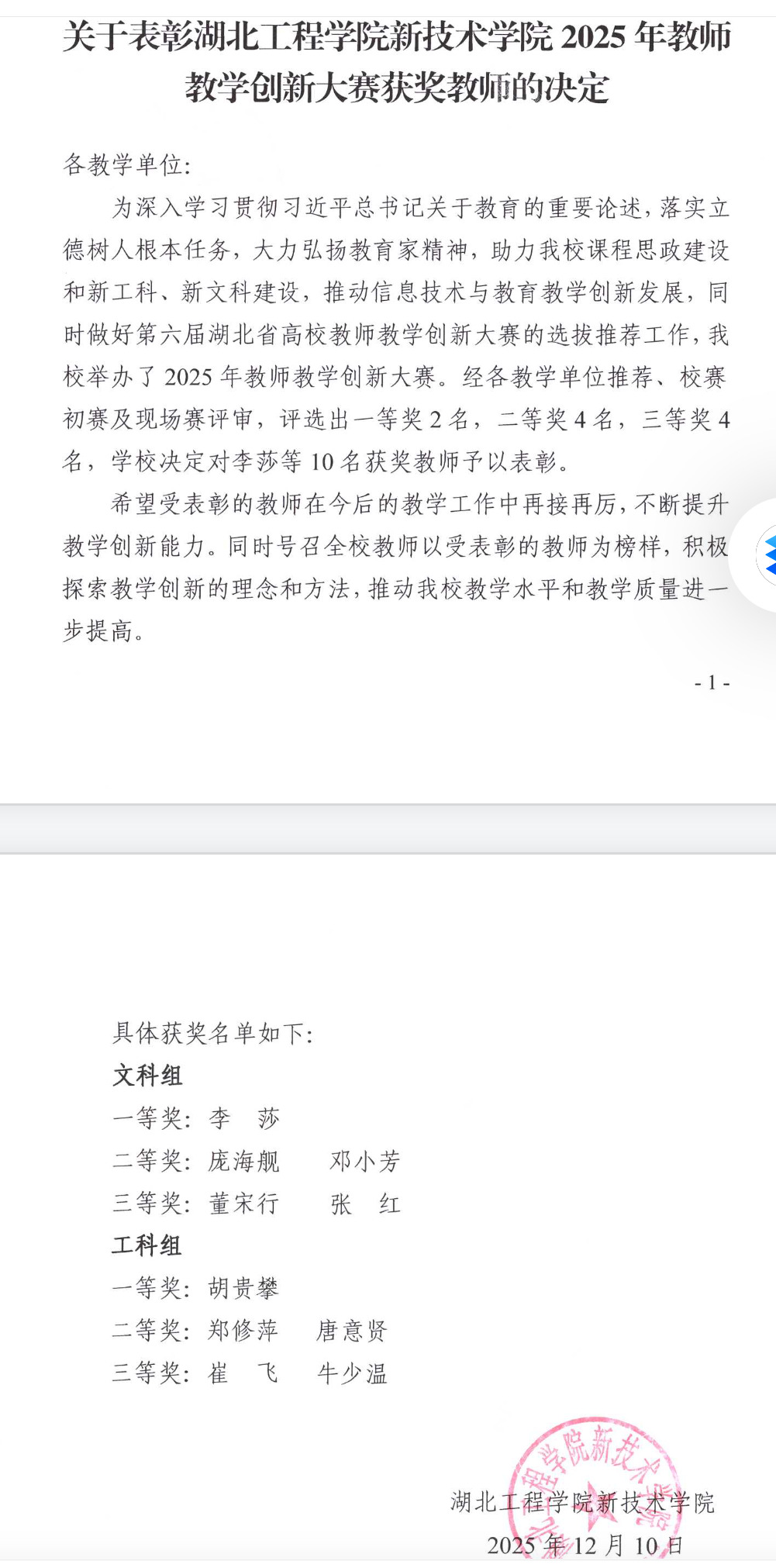 近日,湖北工程学院新技术学院2025年教师教学创新大赛表彰决定正式公布,我系教师在本次赛事中积极参与、表现突出,多位教师斩获工科组奖项,展现了我系在教学创新领域的扎实实力。